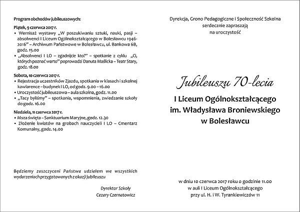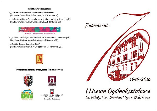 Serdecznie zapraszamy na wernisaż wystaw „W poszukiwaniu sztuki, nauki, pasji – absolwenci I Liceum Ogólnokształcącego w Bolesławcu 1946-2016” oraz „Jolanta Ajlikow-Czarnecka – artystka, pedagog i metodyk”, który odbędzie się 9 czerwca o godz. 15.00 w Archiwum Państwowym w Bolesławcu przy ul. Bankowej.