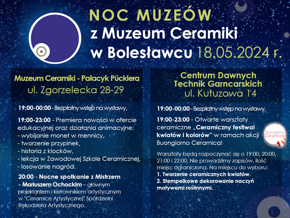 👉 O godz. 19.00, 20.00, 21.00 i 22.00 warsztaty ceramiczne organizowane w ramach międzynarodowej akcji „Buongiorno Ceramica!”.