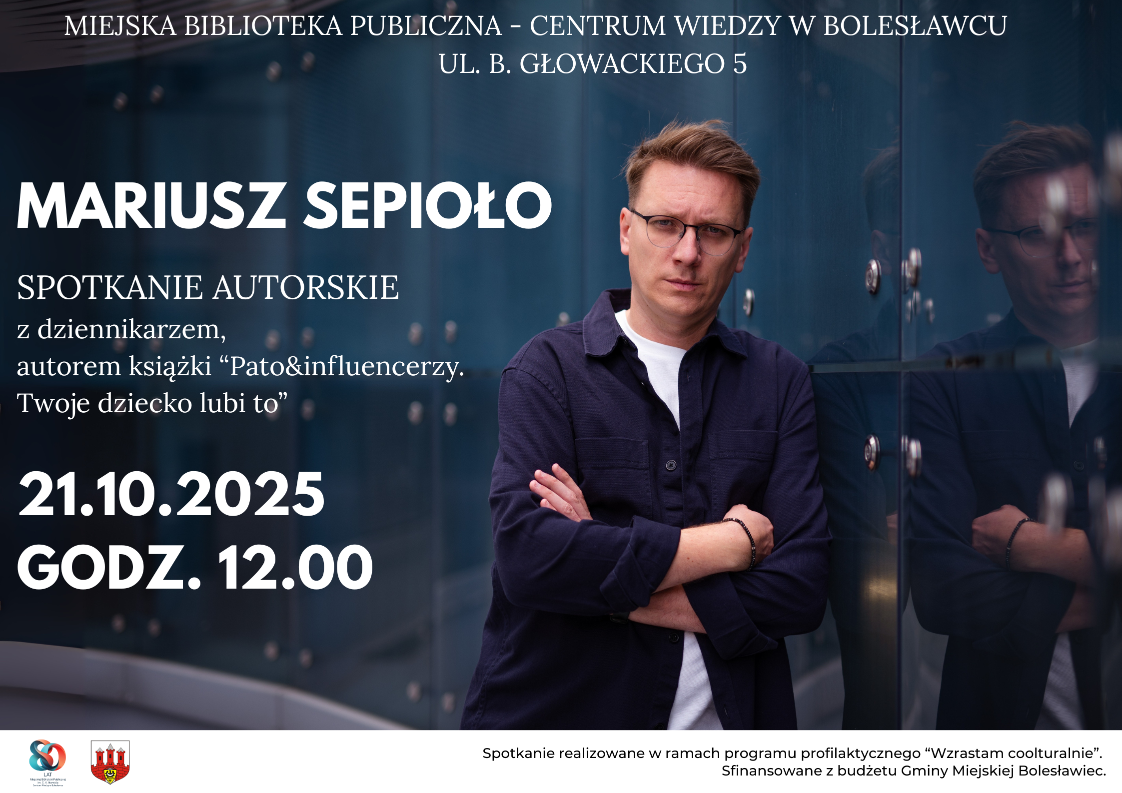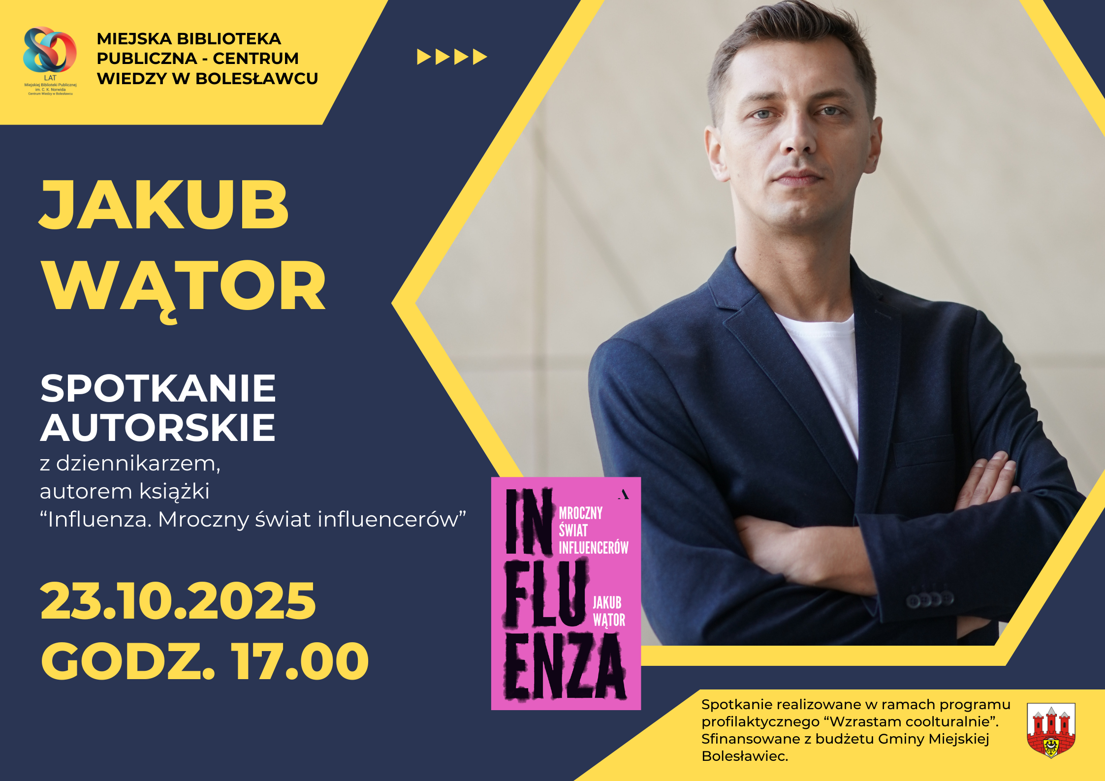 21.10.2025 o godz. 12.00 z Mariuszem Sepioło, autorem książki „Pato&influencerzy. Twoje dziecko lubi to” oraz 23.10.2025 o godz. 17.00  z Jakubem Wątorem, autorem książki „Influenza. Mroczny świat influencerów”. Wstęp wolny.