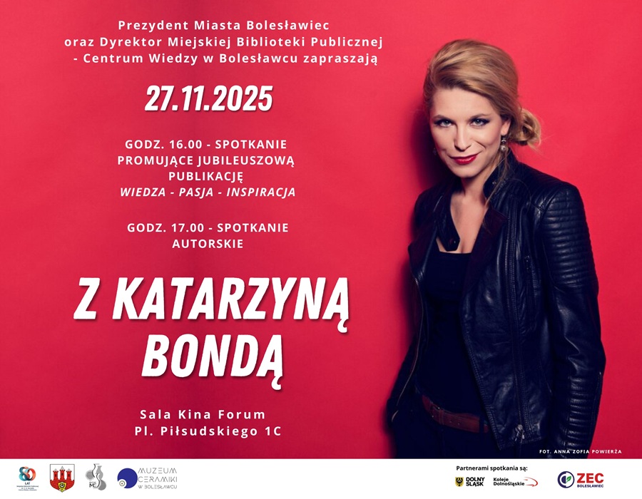 Prezydent Miasta Bolesławiec oraz Dyrektor Miejskiej Biblioteki Publicznej – Centrum Wiedzy w Bolesławcu zapraszają 27 listopada 2025 r. o godz. 16.00 na spotkanie promujące jubileuszową publikację „WIEDZA – PASJA – INSPIRACJA. 80 LAT MIEJSKIEJ BIBLIOTEKI PUBLICZNEJ  IM. C. K. NORWIDA – CENTRUM WIEDZY W BOLESŁAWCU”, następnie o godz. 17.00 spotkanie autorskie z Katarzyną Bondą – autorką bestsellerowych powieści kryminalnych!